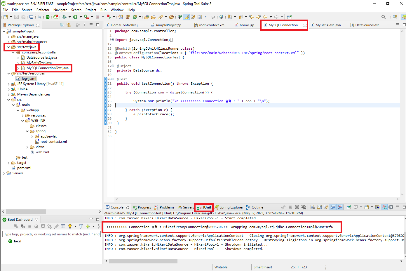 jUnit 테스트 해보면 아래 그림과 같이 MySQL, MyBatis 모두 잘 동작하는 것을 볼 수 있다.