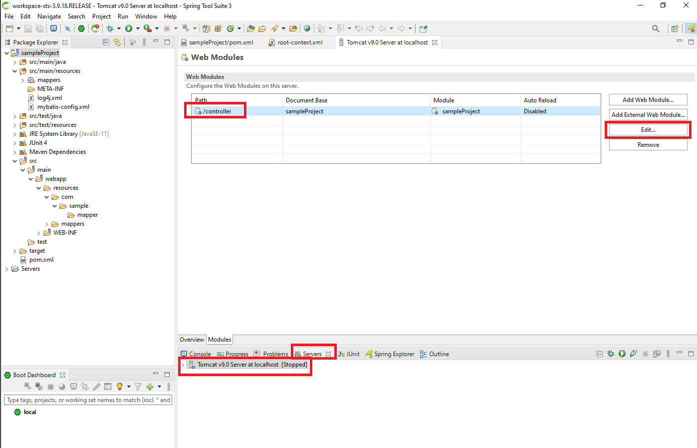 [Servers] > ['Tomcat' 더블클릭] > [Modules] > [Edit] > ...