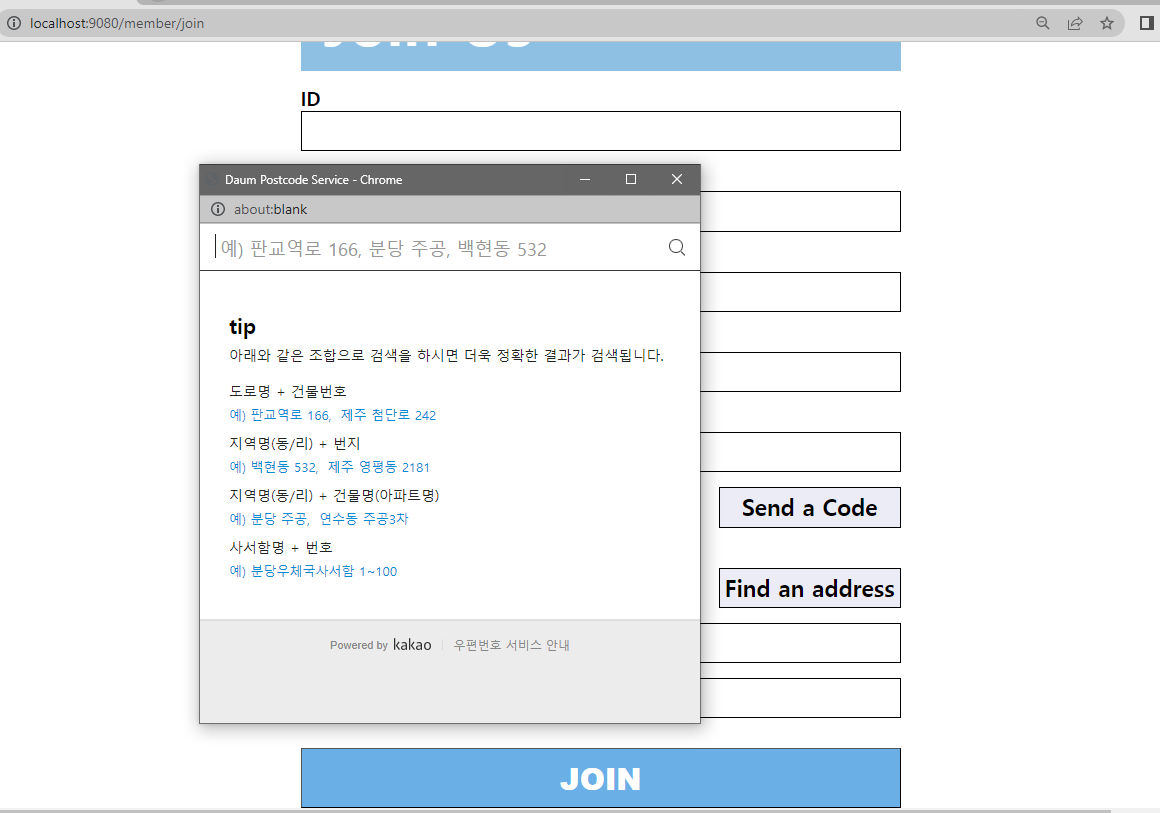 위 링크를 들어가보면 주소 검색 팝업창을 띄우는 코드가 적혀있다.