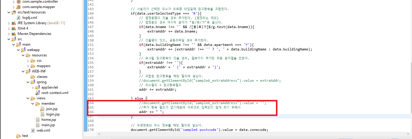 } else { // 사용자가 지번 주소를 선택했을 경우(J)