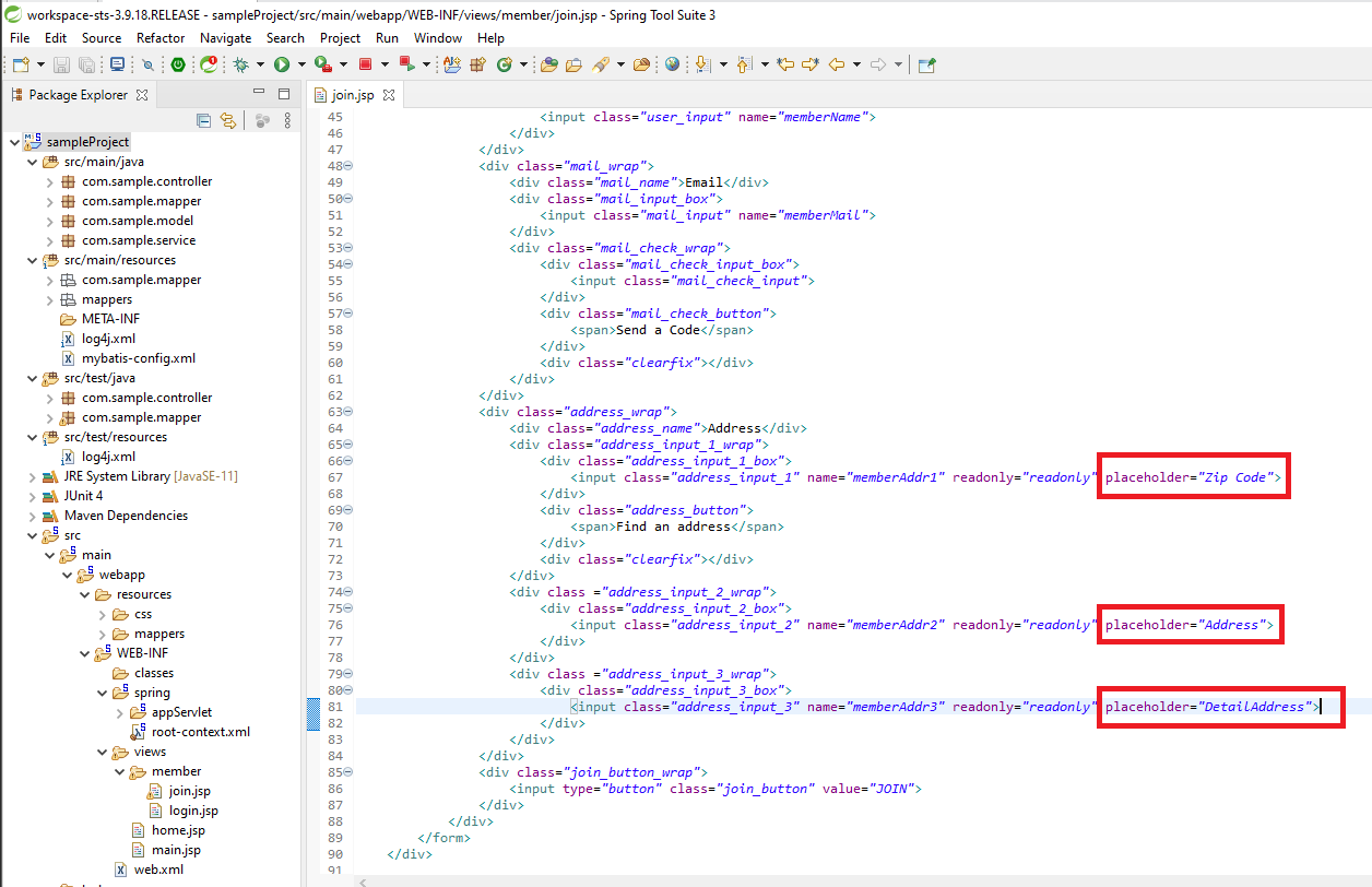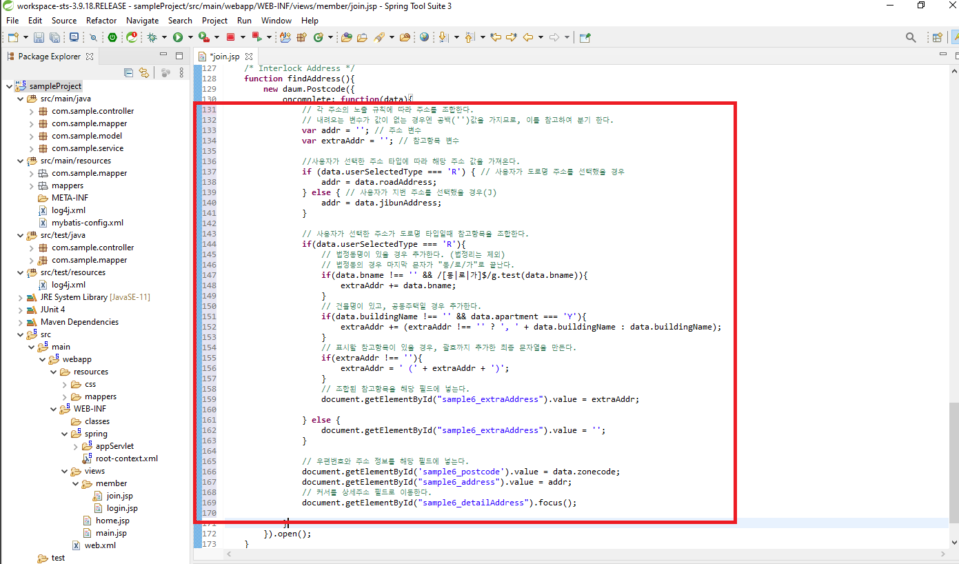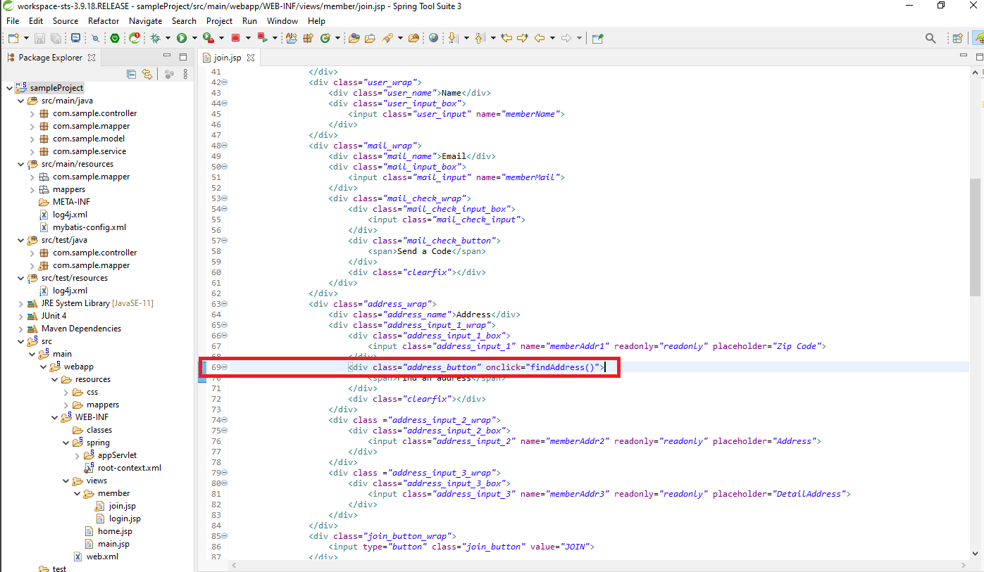 Daum 주소 API 홈페이지에 주소필드에 입력을 하기 위한 예제 코드들이 있다. 그 중에서 원하는 코드를 복사해서 추가해주면 된다.