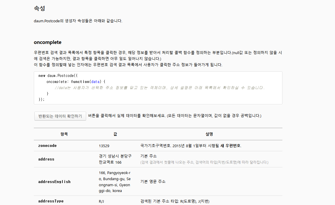 ㄴ> 이때 function(data)에서 data는 선택한 주소에 대한 정보를 반환받는 변수이다. 이 변수가 어떤 데이터를 반환받는지는 위 Daum 주소 API 홈페이지에서 확인 가능하다.